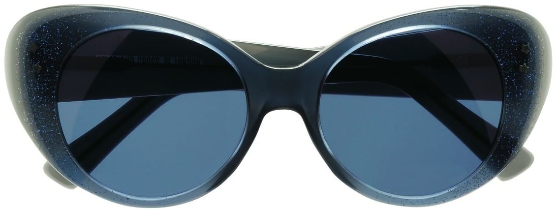 “This sunglass style is right for me,” says Monica, ” because I love 40s and 50s fashion; I am wearing a 40s style playsuit in this picture which I designed myself for my own collection. The cardigan is a vintage 50s piece. The Cutler & Gross Blue Sparkle sums up the blue sparkling ocean on a hot summer day. The style represents pure Hollywood glamour with a vintage feel, perfect for Mermaids! I look for frames that suit my personality and style, as I collect vintage 40s and 50s hats, clothes and jewels. I have a tendency to choose cat’s eyes to complete my look, but I also love what is current and on trend. I have more evening wear than day wear; I adore the works of McQueen, Givenchy, Lanvin and Westwood.”
