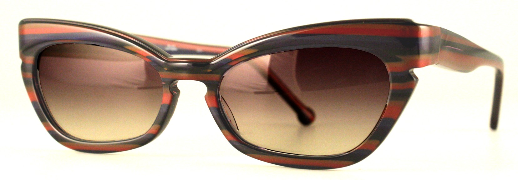The epitomy of eccentric eyewear, I am very delighted to be able to present l.a. eyeworks’ fabulous Toluca sunglass. This chic cat, a must-have shape this summer, comes in a very lush striped acetate, a colour referred to as “Blue Purple Friends”. A typical feature of the plastic frames by this company, Toluca features clever milling (the technique used to cut away layers of the acetate material) to give a contoured brow and a decidedly flirtatious design. A frame to make heads turn “from Hollywood to St. Tropez”. Also available in some other imaginatively named colour choices: “wine and grapes”, “nut butter”, and a real stunner for the ladies, “girly pinks”. www.laeyeworks.com CN