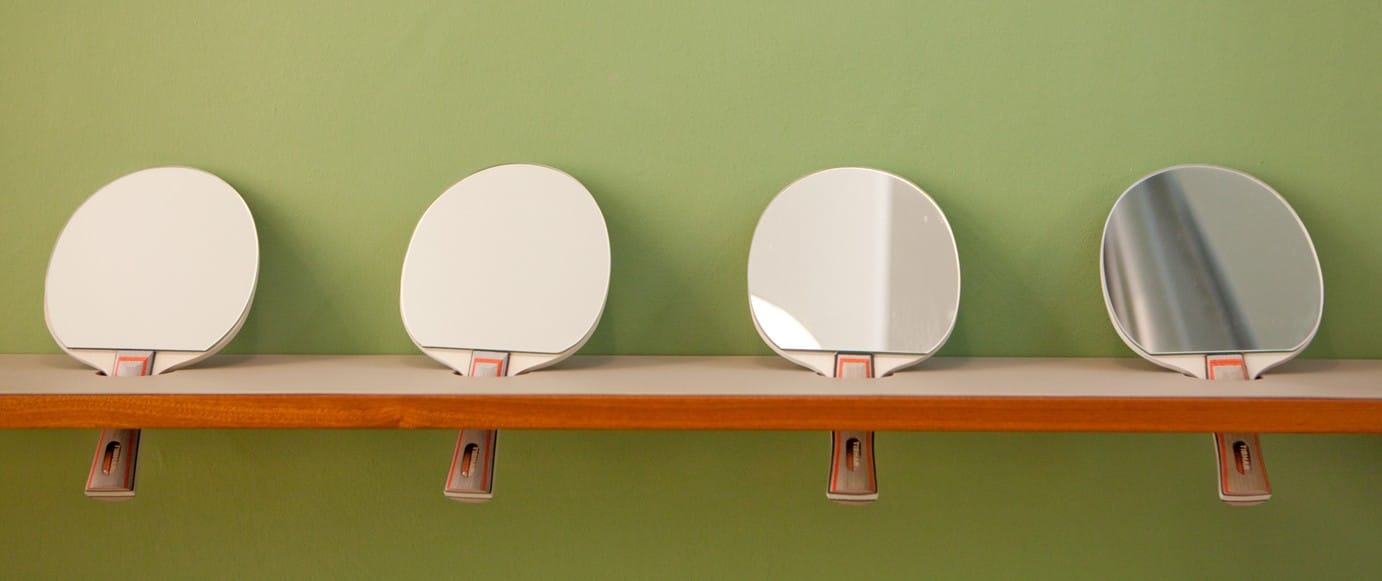 “The store is like a vintage living room with a warm atmosphere. We reconstructed the whole interior, to create a shop that moves away from the traditional stark and cold optical environment. I chose furniture and a living space that is a reflection of my own taste. I like Danish classics such as Wegner, Juhl and Jalk. The seats are from Grete Jalk (1961), and we have industrial German lighting from E.Bolich The floor is covered in old-school linoleum, which adds a vintage edge and is similar to that used in old-fashioned classrooms. We had a tie display unit from the 1950s converted to display some of the glasses. We designed table tennis racket mirrors which hang on the wall”.