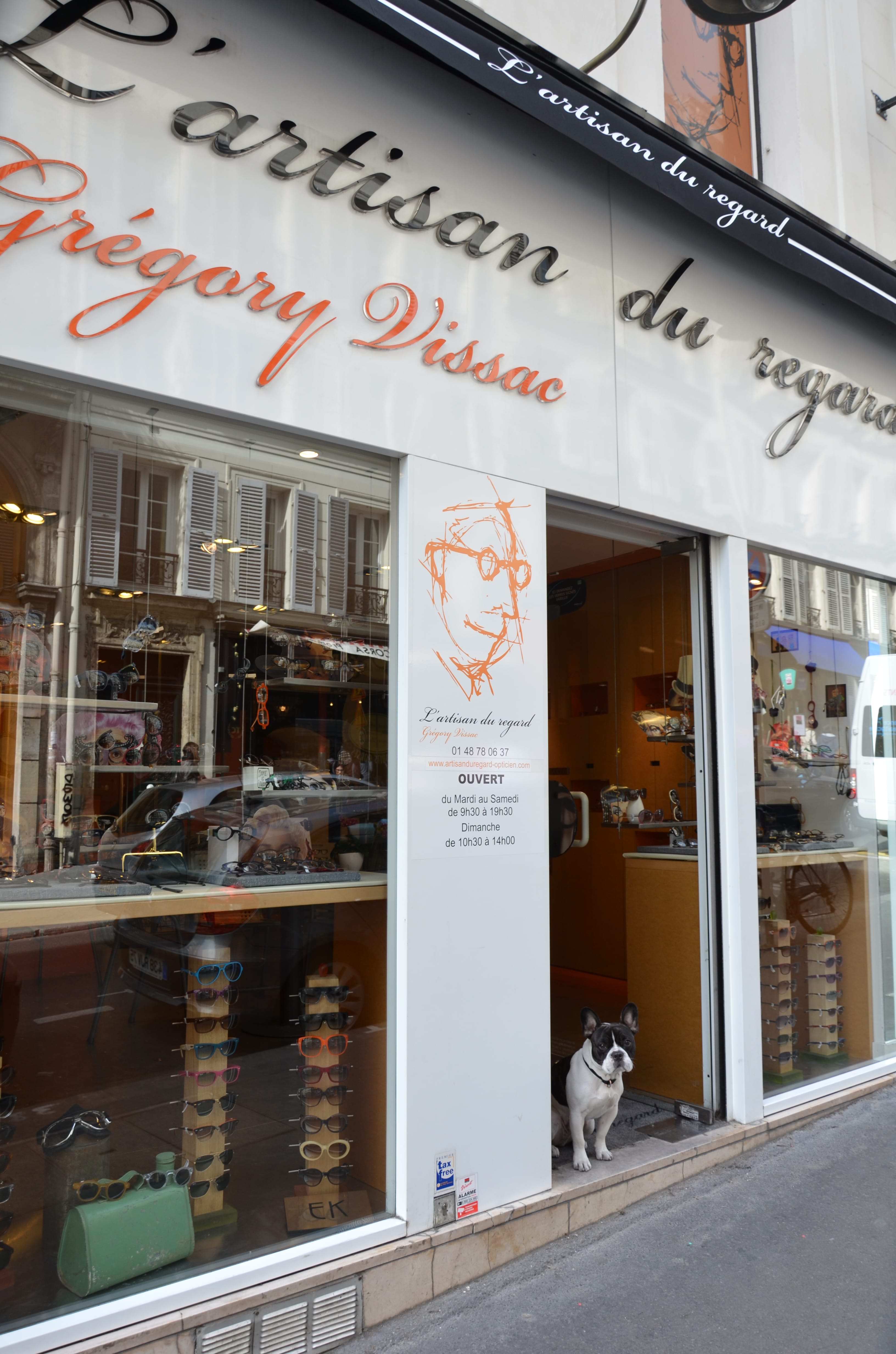 1st June 2012 A lovely friend visiting from Switzerland introduced me to this delightful Parisian boutique – it’s always fun to discover something wonderful virtually on your own doorstep! L’Artisan du Regard is located in the 9th arrondissement of Paris, on a totally charming street, with the atmosphere and tempting shops of a little village. “I adore the 9th arrondissement, and la rue des Martyrs has the true spirit of the artisan,” explains optician and boutique owner Grègory Vissac, “and there are very few franchises in the street – which is more and more rare”. L’Artisan du Regard opened in 2008, and the architecture was created by Fréderi Tabary from Nantes, on the West coast of France. The environment is stylish and very personal with a warm ambience – uplifting orange, green plants – and most of all, gorgeous frames. To feel really at home, Socrate, Grègory’s four-footed friend, waits at the front door to welcome visitors.