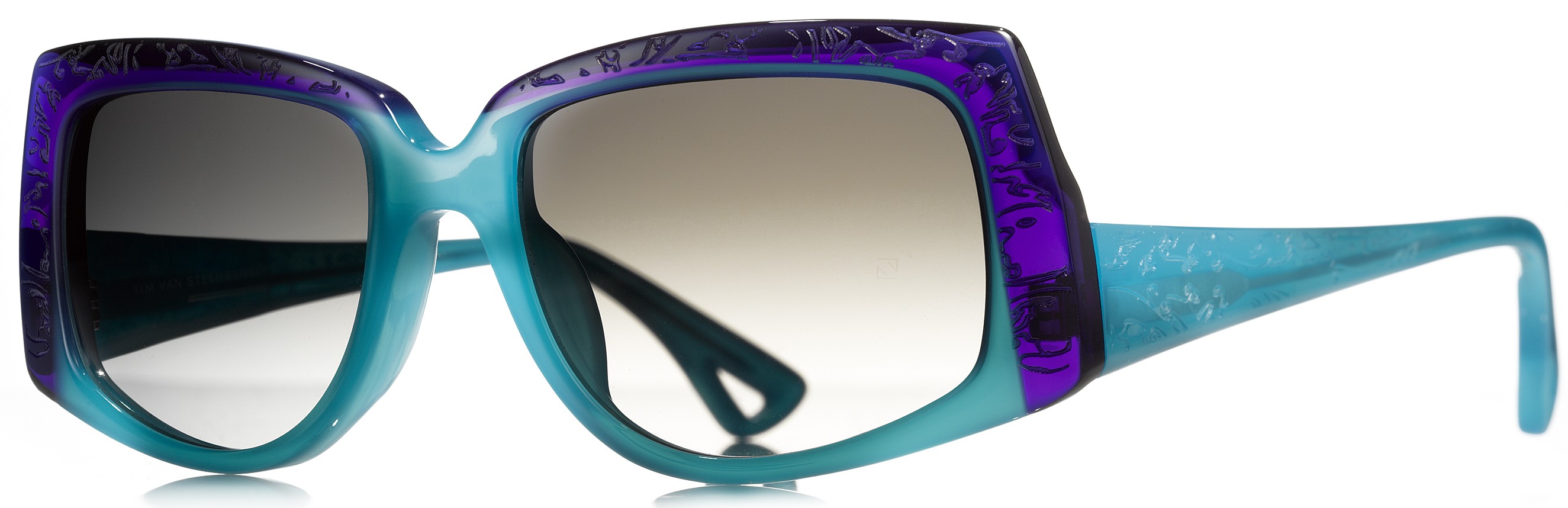 One of the amazing aspects of colour is how the totally unexpected can work so effectively – such as pairing purple and turquoise. Natalia 109 is a vivid new colour mixture from Antwerp based Theo – glossy layered acetate features inlaid texture on the top of the fame and the temples. The effect is riveting – bold, bright and beautiful! www.theo.be JG
