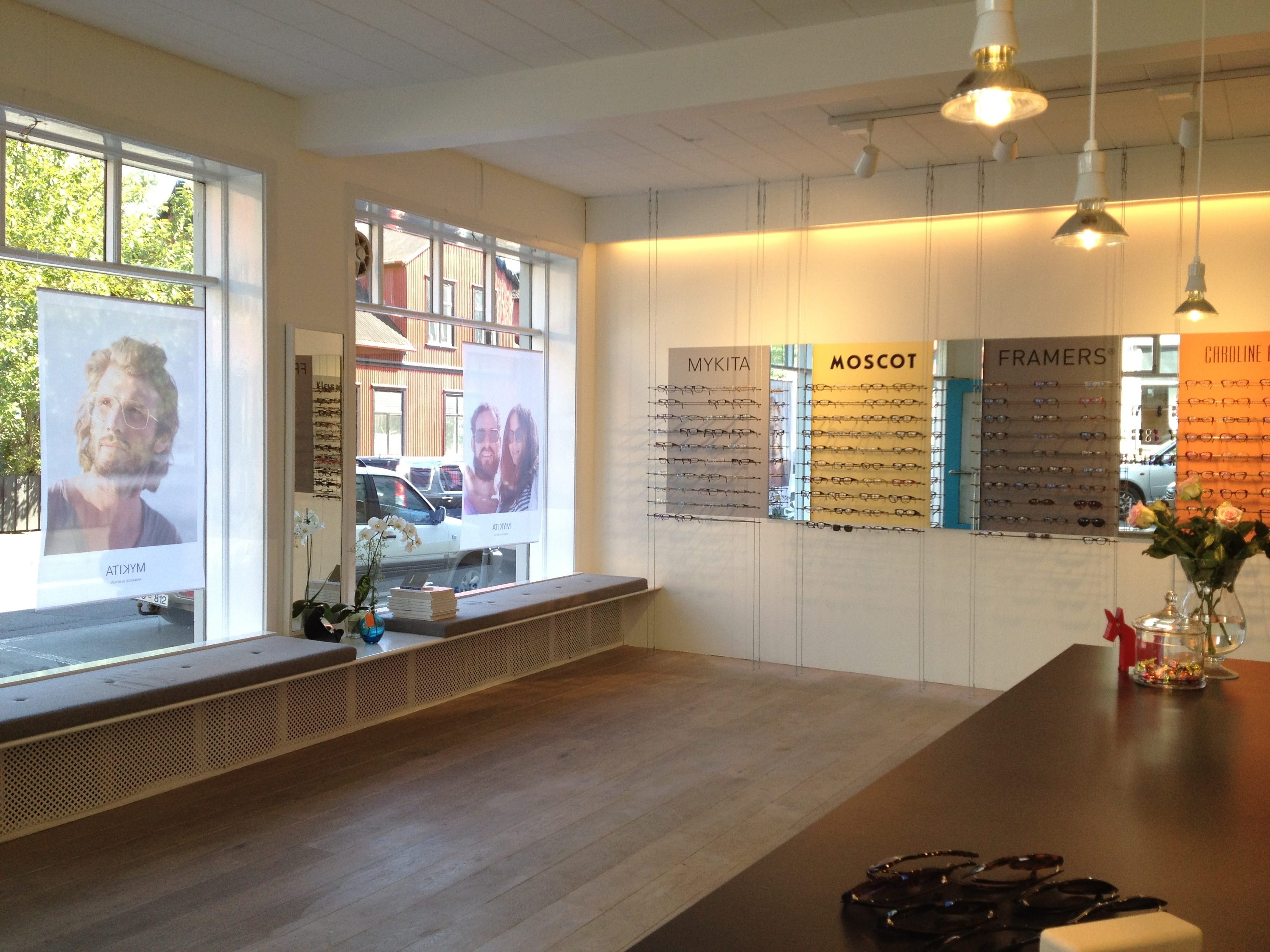 The designer names featured in the shop include Framers, Paul Frank, Theo, Caroline Abram, Moscot and Mykita, among others. Large windows allow passersby an unobstructed view from the street into the shop. The concept is minimalist, with warmth, comfort and a very pleasant ambience. “We have noticed that customers seem to be looking for more conservative/earth tones, or ‘safer’ colours like black, blue, or dark brown, and tortoise has been popular as well. Which is interesting and could be connected to the post-crisis mentality that is a major topic here in Iceland, and is opposite to the pre-2008 economic collapse style that was all about bright colours and crazy shapes. Round shapes and Panto-style glasses remind us of early 20th century design, as well as the continuing 50’s and 60’s plastic frame trend.”