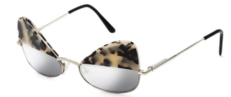 Back is the Swedish fashion maverick whose designs are described habitually as subversive, so this unusual combo frame -which loosely interprets a cat’s eye but works it into quite an angular bug eye shape with an acetate top – is in line with her imaginative fashion creations – perhaps you will remember her blood-dripping sunnies back in 2009?