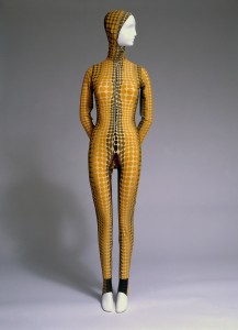 The “Cyber Suit,” hooded nylon/spandex knit catsuit printed with “Op-art” circle pattern in gold, olive, purple and gray, engineered to body contours; square back appliqué panel with “cyber” face; padded shoulders; attached feet with open toe; CF exposed zipper