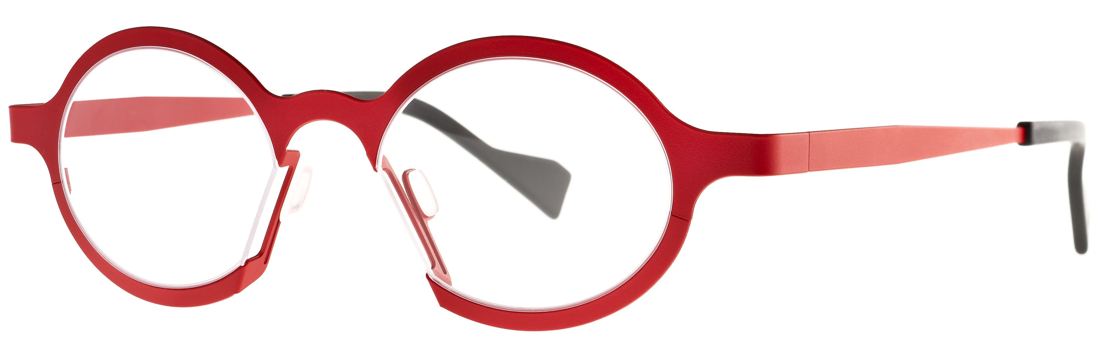 Theo has also collaborated for the third time with designer James Van Vossel. His latest creation is frames with integrated nose pads (above). Out of one thin metal plate, Van Vossel cut a shape in which he already provided a nosepiece. Then, he bent the nosepiece backwards, so there is no frame between the lens and the nose. An innovative masterpiece! James 6 is a trendy round shape and in bright red – brimming with colour vitality. www.theo.be JG