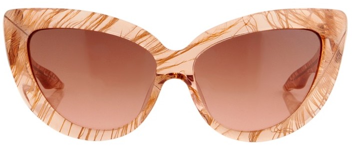 21st May 2013 Looking for something different this summer? Eyestylist has noticed some stunning transparent acetate designs with very special inlays inside the frame structure. From Linda Farrow and shoe and accessory designer, Charlotte Olympia in a collaborative collection, this showy piece (above) displays a tantalising coloured ostrich feather inside the clear acetate frame. It captures the mood of Olympia’s other pieces, such as her wicker bag featuring traditional wicker work mounted in transparent perspex. The sunglasses come in four delicate colours, including the peach/champagne version pictured above. www.lindafarrow.com