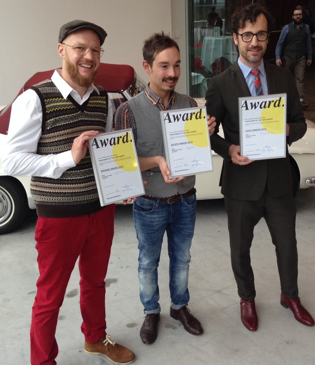 22nd October 2013 The winners of the 2013 Hall of Frames/Eyestylist Newcomer Awards were announced in Stuttgart on Sunday. Designers from three different countries were recipients – Suzy Glam from The Netherlands took the top prize with Gold; Hapter from Italy won Silver; and Bronze was awarded to Coblens from Germany. Opticians from leading fashion forward shops chose the final winners. There was great anticipation in the lead up to the event, and the winners were delighted and surprised! In the above photo, left-to-right – Marcus Knoop, sales representative for Coblens accepted the award on behalf of designer Fabian Hofmann; designer Eric Balzan from Hapter; and Etienne Frederiks who collaborates with Susanne Klemm at Suzy Glam. Our warmest congratulations to all the winners from Eyestylist and Hall of Frames! JG