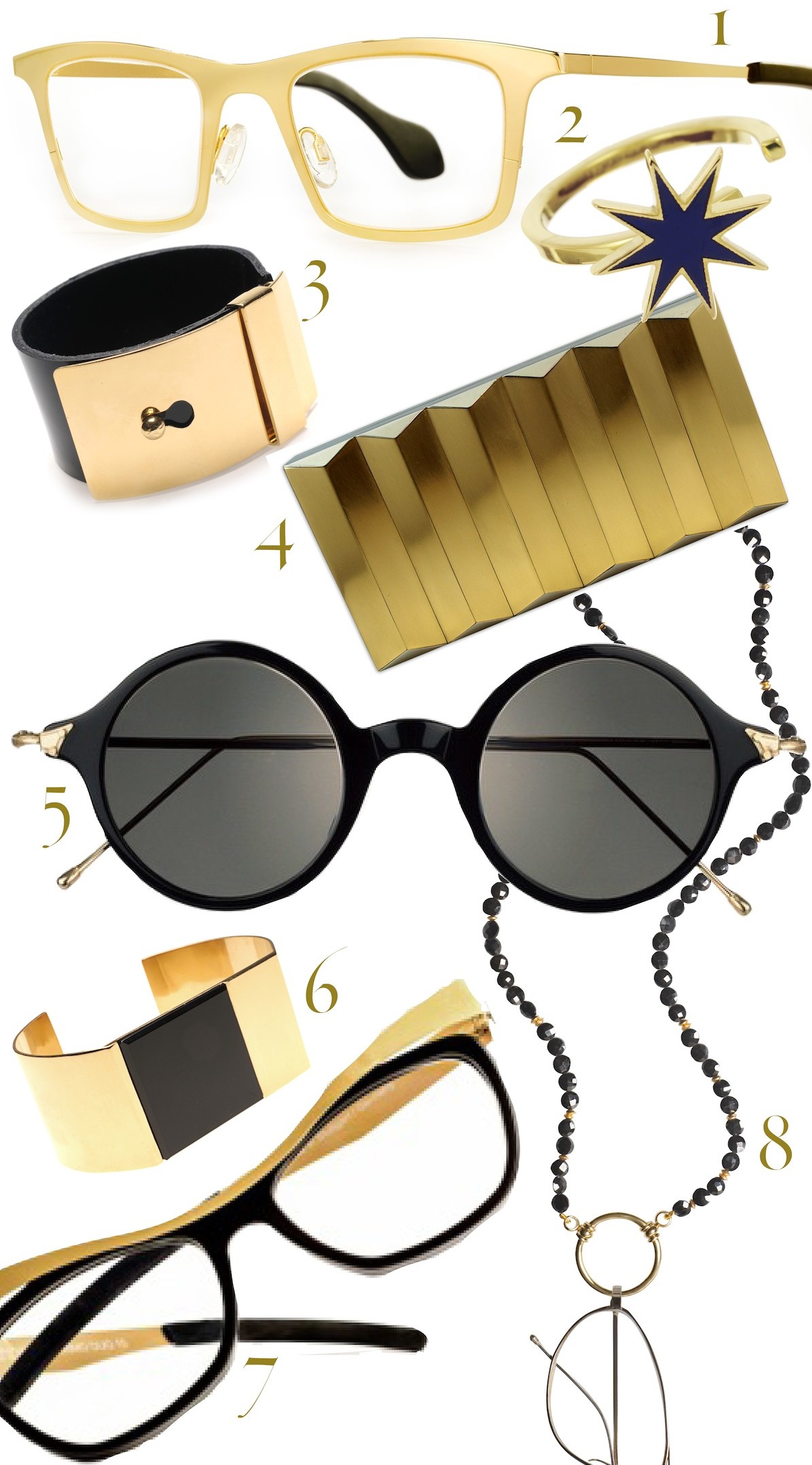 1. 24k gold-plated palladium style Mille 23 from theo eyewear, www.theo.be; 2. black/navy star ring by Sardo, Atelier di Gioielli, www.sardogioielli.it; 3. Wouters & Hendrix cuff with gold buckle, www.wouters-hendrix.com; 4. Eventail clutch from Babe by Dennis Pong / Hong Kong, www.babe.com.hk ; 5. British made ‘Bond’ in gloss black, by Savile Row, at Algha Works London, www.algha.com; 6. Gold/black cuff by Wouters & Hendrix, www.wouters-hendrix.com; 7. Cosmo Duo 15 by Benner Eyewear, handmade in Germany www.bennereyeweardesign.com; 8. Black beaded gold glasses chain by New York’s La Loop www.laloop.com CN