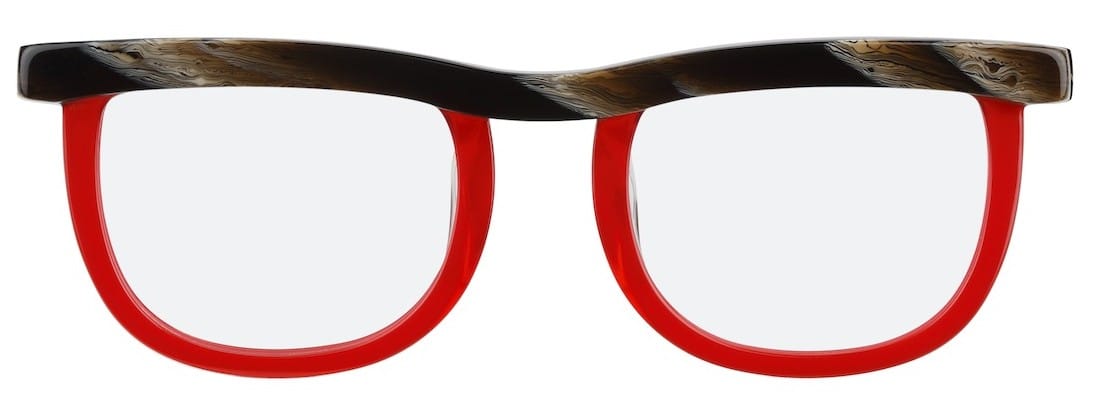 In the same vein, Topas by Veronika Wildgruber combines a minimal optical shape with flat top and two-tone effect where red is used under the horn-effect browline to circle the eyes. Dramatic and memorable. Wear as an optical or with sun lenses. www.veronikawildgruber.com CN