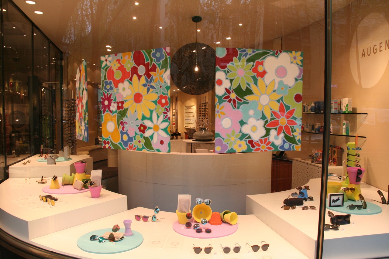 Augenweide is one hundred and fifty square meters, so the feeling is delightfully open, airy and welcoming. Beige and cocoa tones, with black floors, and beautiful, warm wood panelling and cabinets further enhance the ambience. Large windows offer the possibility of spacious displays, and during Eyestylist’s visit, the decoration included lavish flower paintings by a local designer, in bright spring colours, along with cheerful flowerpots, and beautiful frames. Discover more at www.augenweide.de JG