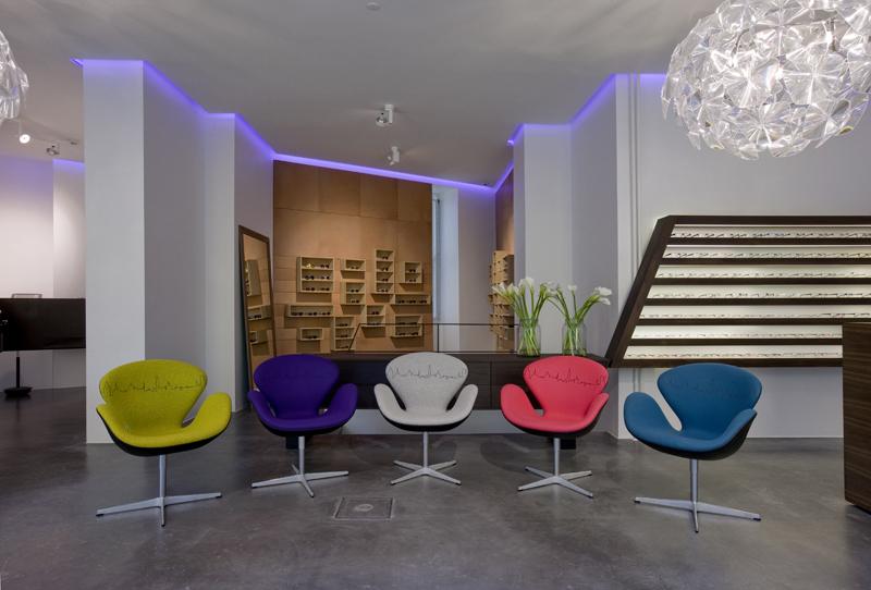 When you step inside, you know you have entered their ultra modern world of design. An über interesting duplex is designed to echo the sleek and chic lines of their designer eyewear, as well as its colours – in specific details such as the fluo lighting. The testing and consultancy room is in the basement, out of view, but offering full eye examinations, consultancy and lens expertise.