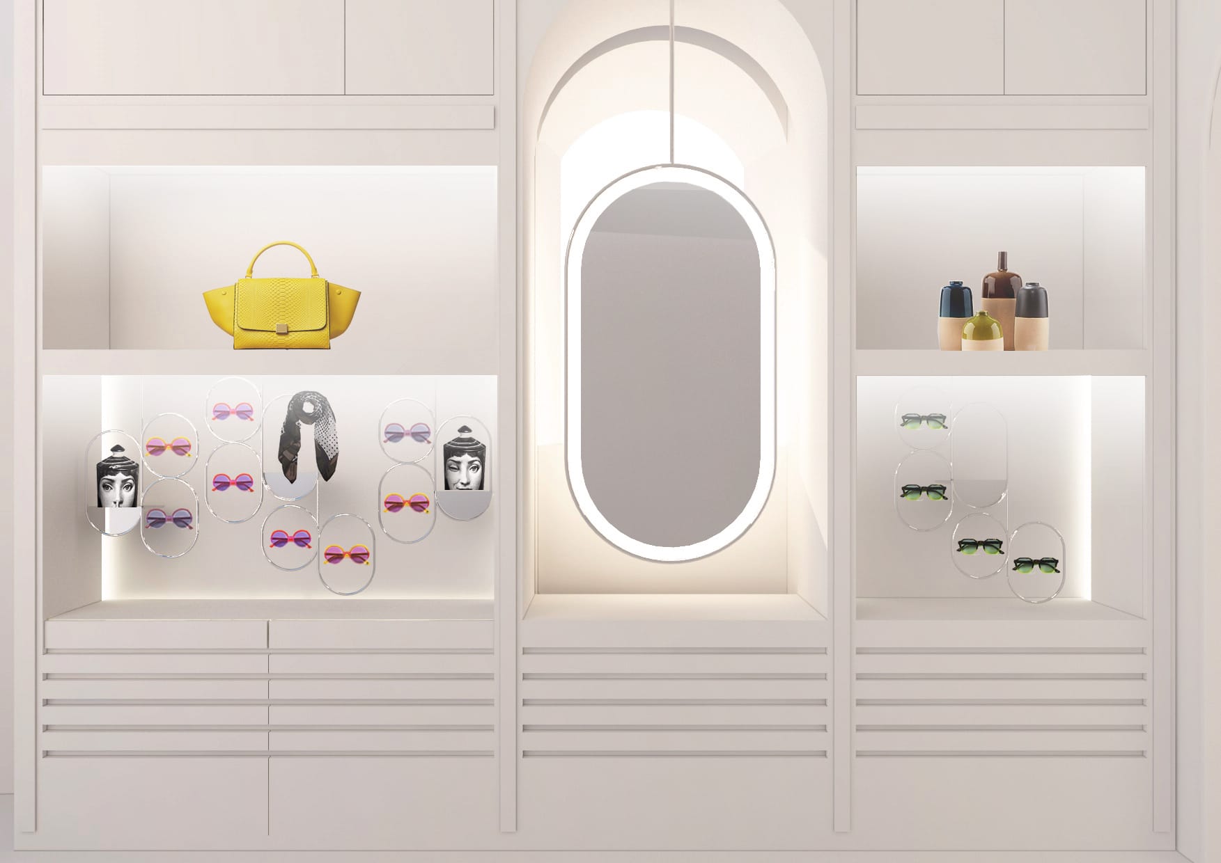 The minimal interior, balancing bright colour and elegant white displays was designed by Claudia Campone of Studio THiRTYONE in Rome. An area for eye tesing has also been included as part of the project – allowing the team to offer state-of-the-art eycare as well as beautiful accessories.