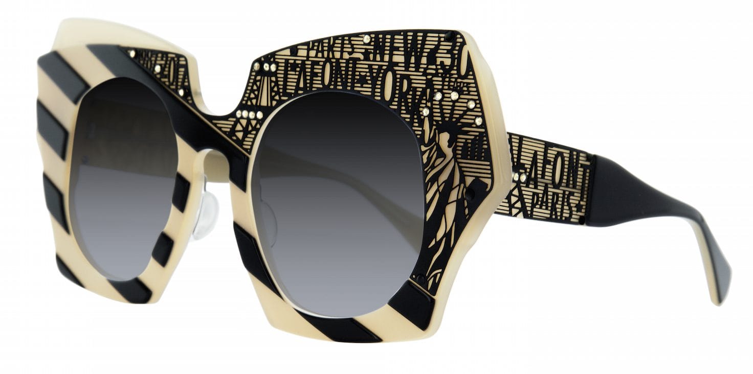 Certified with the Origin France Guarantee, model Thirty represents an iconic design with an exciting decorative concept. The asymmetrical black and ivory carved acetate sunglass style is embellished with cut outs of the Statue of Liberty on one temple and the Eiffel Tower on the other.