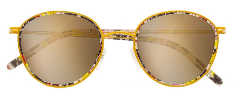 Model Deligny by Lafont is one of those classics with a twist that is achievable only through exceptional expertise and precision in the making. In the version pictured, the retro inspired round design incorporates a floral cotton Liberty print in the narrow acetate inner rim of the eye shape as well as in the temples; the metal coloration picks up the bright yellow in the fabric creating a vibrant colour mix, an effect that is typical of the artistic Lafont style, and one that can be traced back through earlier collections.
