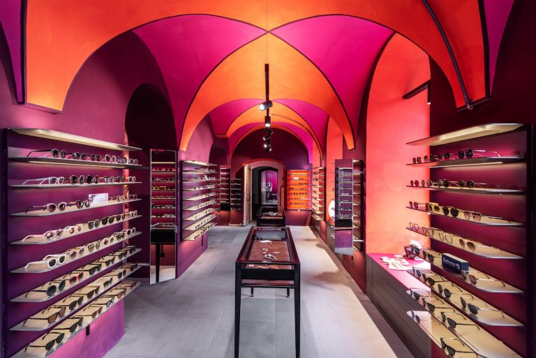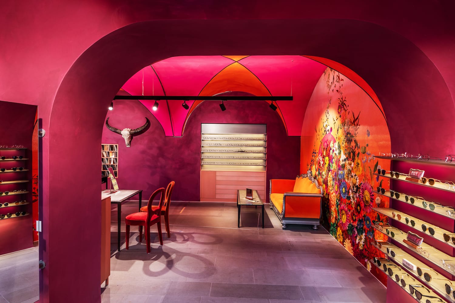 Stoffels, who created the interior design for the store with Jaqueline van Maren, architect and interior designer, said the aim was to open a hip optical store in the very traditional historic setting, with a unique experience compared to other stores and an open and appealing outlook for young people. “We wanted to attract attention in a well-known location,” he added, “where thousands of people walk by every day. The brilliant colours are inspired by Yves Saint Laurent and his love for Marrakech, and the vibrant “Blumlihalle” (hall of little flowers) in Zurich, painted by Augusto Giacometti, nephew of the famous Swiss sculptor.” The exotic interior and its elegant furnishings create a setting that is more like a luxury living room than an optical retail space.