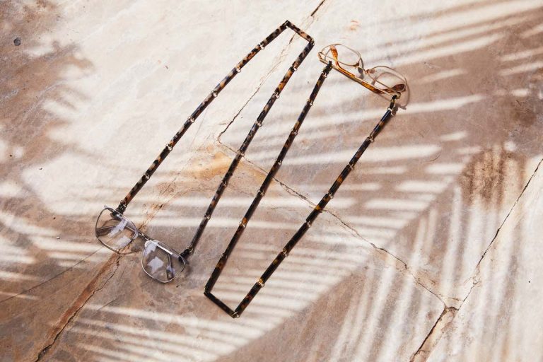 There’s something about eyewear chains that has captured our attention over the last few years. Big brands and independent designers have re-worked their look in nice materials, and with jewellery details and decorative concepts that have turned them into a desirable must-have statement. Above: Brand new from Oriss London: Spaghetti chain in light Tokyo tortoise made from a biodegradable bio-acetate material