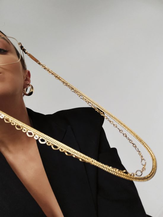 The Vintage Disco collection features graphic or sensual links in 18ct yellow, white or rose gold plating. The styles are versatile, functional, stylish and fun: you can chain your frames with one style or layer them for added glamour. Each chain can also be worn as a necklace or choker.