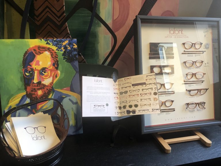 It’s coming up to one year exactly since our visit to the creative studio of Thomas Lafont and Lafont Paris HQ in Issy-les-Moulineaux, a leafy south western corner of Paris near Porte de Versailles. This elegant, personal and historic world of creativity continues the traditions set by earlier generations since 1923, and Laurence and Philippe Lafont, Thomas’ parents before him. In their place of work, brothers Thomas and Matthieu Lafont, now the custodians of the business, are surrounded by fine books and arts and textile inspiration, as well as the rich and colourful archives of the esteemed French family business. Above: at the entrance of Lafont Paris, an explanation of the making of Jupiter, one of the label’s iconic P3 frames. This wonderfully classic frame style continues to be available – and is updated in a range of colorations.