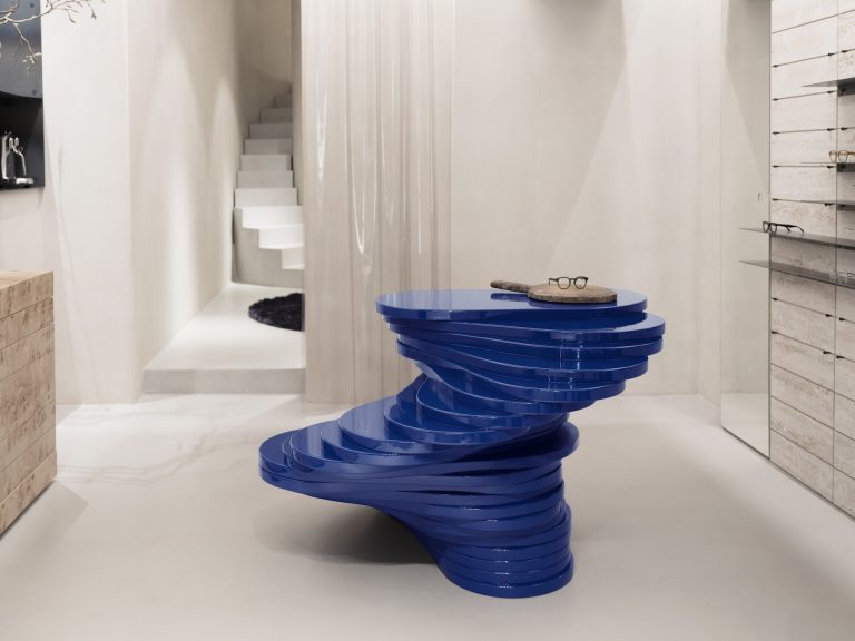 The store concept is a natural extension of the sustainable EOE design philosophy; inspiration from nature with a distinct focus on material, form and detail: a blue table is inspired by a waterfall; the displays are made from travertine, inspired by the Swedish mountains.