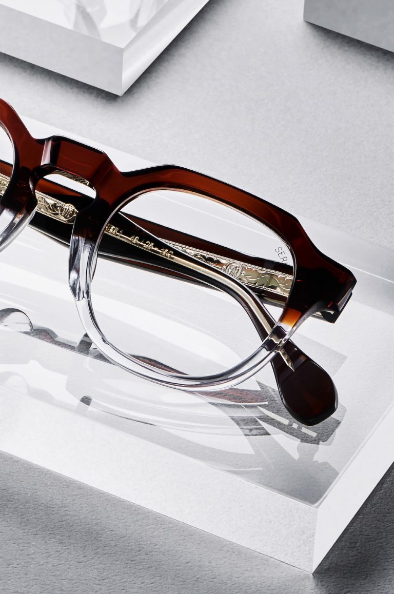 The distinctive models for men have an elegant two-tone front with the look of a browline design achieved via a colour-blocked finish. The design fuses a shape based around a classical French vintage design with an overarching “Crown Panto archetype”, and Japanese handcrafting and traditional spectacle-making precision. Given the rarity of the material, the spectacles are marked with a serial number from 01/99 to 99/99, complementing the intricate Japanese engraving of ‘The Great Wave of Kanagawa’ on the golden core of the design.