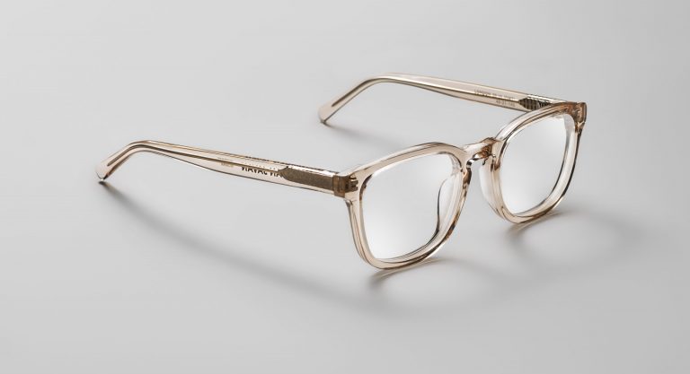 Round glasses are most often suggested for rectangular or square shaped faces but these rules can easily be broken, and the material and thickness of the design can really transform the style and how it looks on different faces. Meanwhile aviator glasses with a square or rectangular eye shape usually flatter oblong and rectangular faces; the double bridge typically has the effect of widening the face and creating a bold statement style. The traditional 1950s browline design (with a heavier line over the top of the front) can be suited to an oblong, oval or diamond shaped face; its expressive statement styling and generally quite large construction is popular with men who seek out vintage style glasses. Above: Nirvan Javan’s London collection – model 09-16 – a classically inspired square shape in a clear crystal acetate, www.nirvanjavan.com
