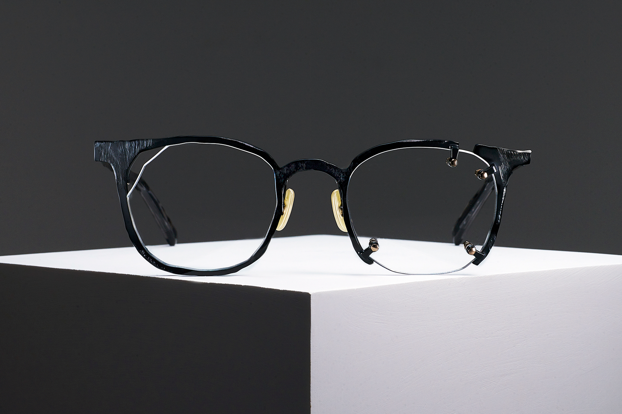 The titanium designs underwent a carefully developed special step of chiselling on the surfaces to replicate the effects of a sculpted work of art. The metal structures are designed without the usual focus on symmetry and with the particular signature style of the designer whose attention to detail never faulters. For the acetate frames, a scraping technique was used to create the intriguing finish of the designs.