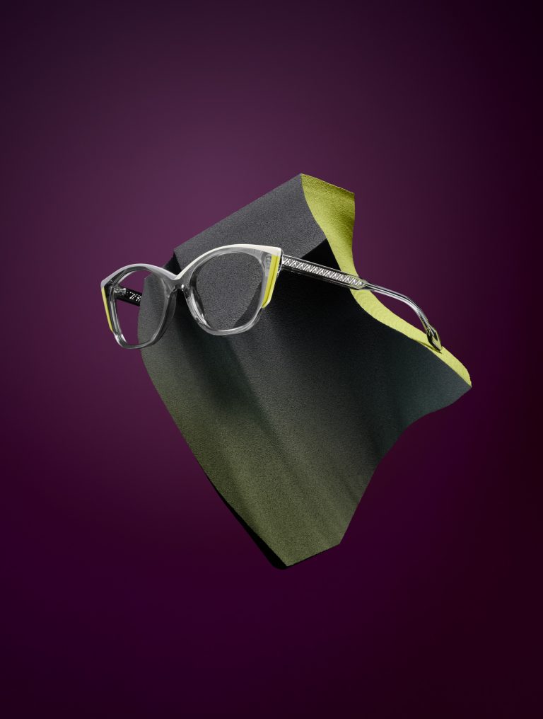 As the new season embraces the artistic effects of transparency and colour in eyewear design (see https://www.eyestylist.com/trend-bulletin-issue-5/), artisan brands have selected refined and unique crystal materials to highlight the see-through aesthetic of the frame. The variation of styles in the perfume inspired collection at RES/REI – the Italian design label – excite the eye with a vibrancy of style. The glasses in the collection are delicately shaped and characterized by temples with metal details. The effect of the material with translucency and colour is surprising when worn, highlighting the eyes and illuminating the natural colours of the eyes and skin. Above: an expression of the season’s subtle colorations, model Aloe features a natural colour combination inspired by the shades of the Mediterranean landscape – the frames has a chic ‘sculpted’ look