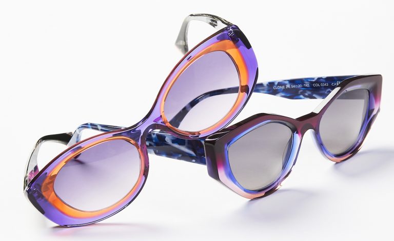 A terrific breadth of inspiration from the past, complex, creative colour schemes and colour accents, and structured, sculptural design work all feature in the new collections that are here as Spring arrives. From cateye sunglasses and edgy 90s shapes, to sharp combinations of hues, a melting pot of many influences defines the season and inspires new, delightful themes. Above: FACE A FACE sunglass models Clone 1 and Clone 2 – ‘a retro futuristic oval and a Matrix shape’ – both styles have a double colour effect on the front and a strongly beveled sculpted look with an artistic elegance.