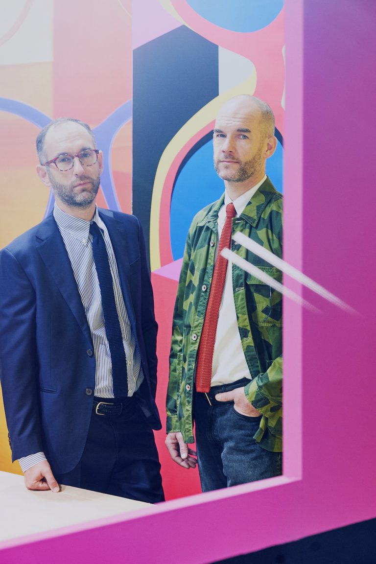 At Silmo 2022, Lafont Paris introduced the third series Limited Edition with model Monaco in four exclusive “upcycled colours” of red, pink, blue and yellow (pictured below, the Monaco in yellow and full set in presentation box). Above: Matthieu and Thomas Lafont – Silmo Paris 2022 – photography by Amanda Sellem, all rights reserved