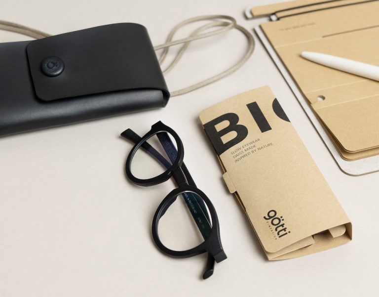 A drive towards using materials that have a lower environmental impact is changing the face of accessories and packaging design produced by independent eyewear companies. At opti Munich, we’ve seen Götti Switzerland launch a new vegan eyewear case, a minimal, smart and beautifully finished product which is made at the company in Switzerland – from a high-quality vegan leather sourced in Europe. Götti Switzerland also uses Swiss-made kraft paper packaging which they have developed and introduced themselves, used as a paper case or protective sleeve, and also suitable for notepaper. Above: Götti Switzerland – vegan leather case, new Bionic frame and multi-use paper sleeve to protect the frames – www.gotti.ch