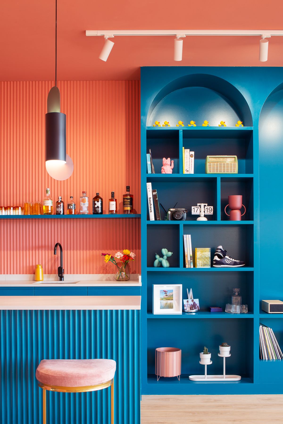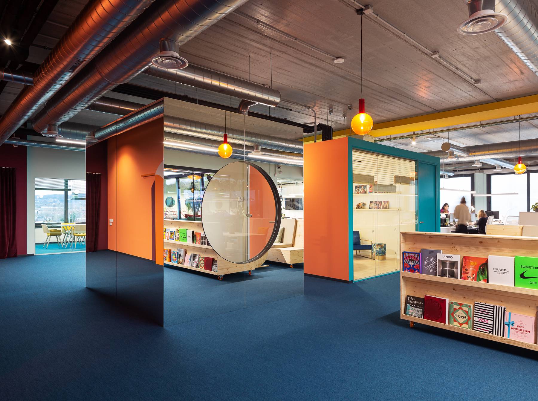 Attributes include wide open spaces, a trendy colour palette with shades of pink-orange coral, bright yellow and bold turquoise blue, a showroom with light wood flooring and natural light flooding in, and brightly coloured contemporary furniture, more typical of a home environment than an office, across its different floors.