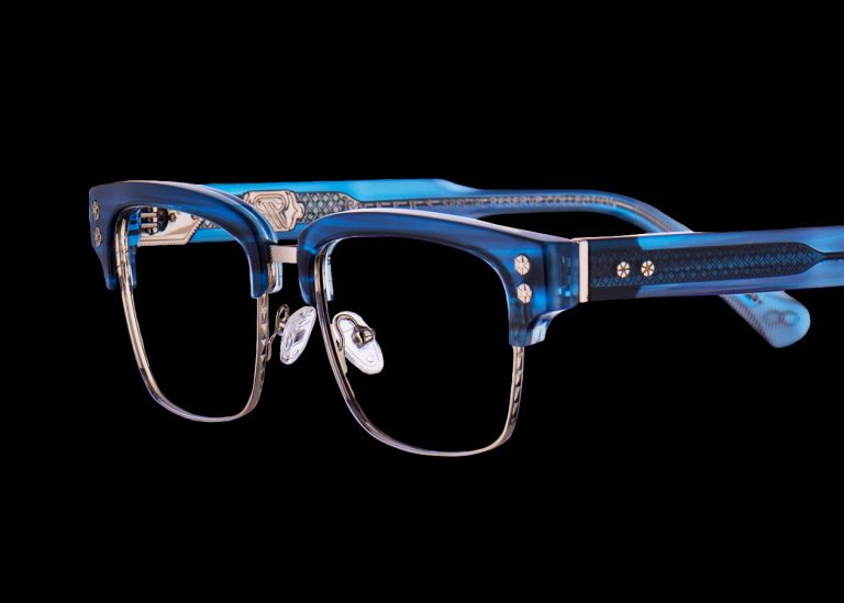A masculine design, with luxurious details, the new Murray style from Erker’s 1879 features a mix of surgical steel and cellulose acetate and has been handcrafted in small batches, only 100 of each colour. A new development for the Special Reserve collection, the Murray is the first eyeglass to stray from the usual acetate build with a combination design. An acetate brow section has been paired with slim metal rims, which are decorated with a diamond-like pattern along the outer edge. Much like the rest of the collection, the frame boasts an ornate temple design and is named after one of the long-time sales reps of the heritage brand. Above: a handsome combination style: the Murray glasses by Erker’s 1879