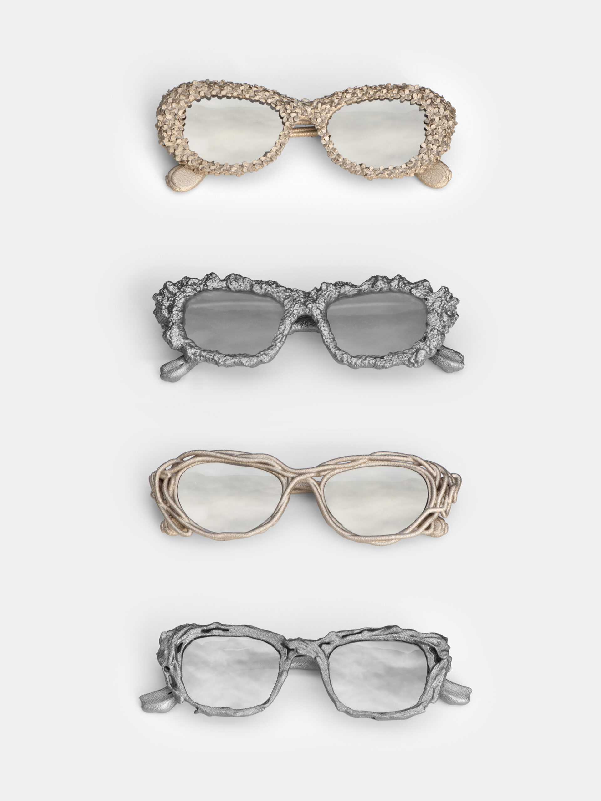 Offering four models, each one is shaped by a different natural reference: florals, stone-like surfaces, naturally growing interwoven plants, and a silhouette that appears like hand-sculpted clay. As a nod to the beaty of natural pattern, the frames are released in gold, silver and bronze tones.