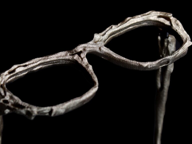 Each style by Boem begins as a digital sculpture, carefully designed and refined over several days before reaching its final form. Produced in very small quantities, each frame requires an extensive cycle of printing, refining and finishing. Crafted in Bohemia, the designs combine lightweight nylon, gold-tinted UV400 lenses and precisely engineered stainless-steel spring hinges. Select editions incorporate a gold finish created in collaboration with Preciosa. All the models are being released in numbered, limited quantities and each one expresses a different relationship to nature and materiality. Above: Boem Atelier Eyewear Sculptures, details of the ‘Boemian’ frame