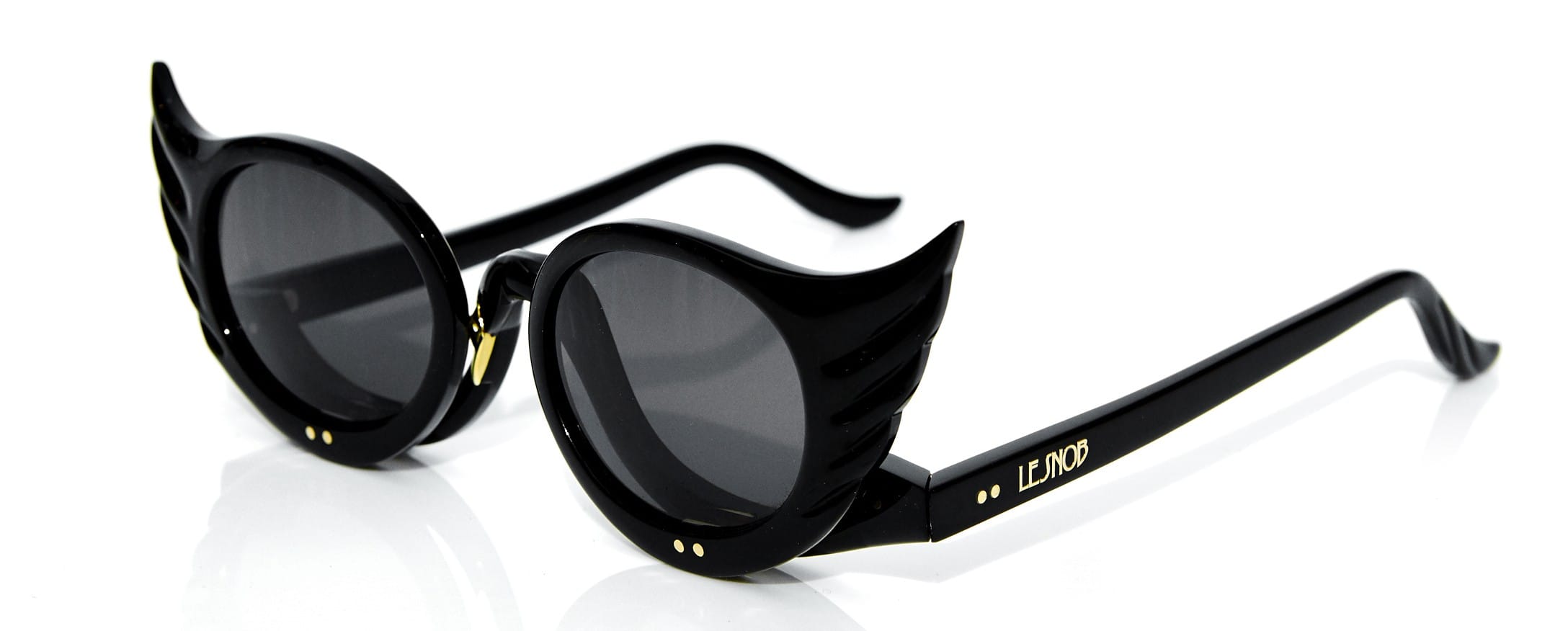 A rather gorgeous exaggerated upswept shape with round lens, the Black Swan sunglasses have flip-down front pieces, a concept that can be traced back to the lorgnettes and make-up glasses of the 1950s/60s. Pictured above: Model Guinevere by Tim Walker for Le Snob. Guinevere wears the new Black Swan shades.