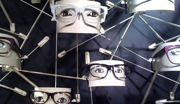 I visited a few days ago for the launch party. This is a very contemporary looking optician’s store showing the full Kirk Originals’ repertoire of frames, which are exhibited in a fun, accessible way: each frame is like a work of art, displayed on white faces with expressive “lenticular” eyes that change as the customer moves around. The interior and window displays are inspired by the Kirk Originals’ Kinetic Collection, a line which uses lenticular printing (the technical term for this type of “moving” almost 3 dimensional, colour-changing imagery) to decorate the temples of the glasses.
