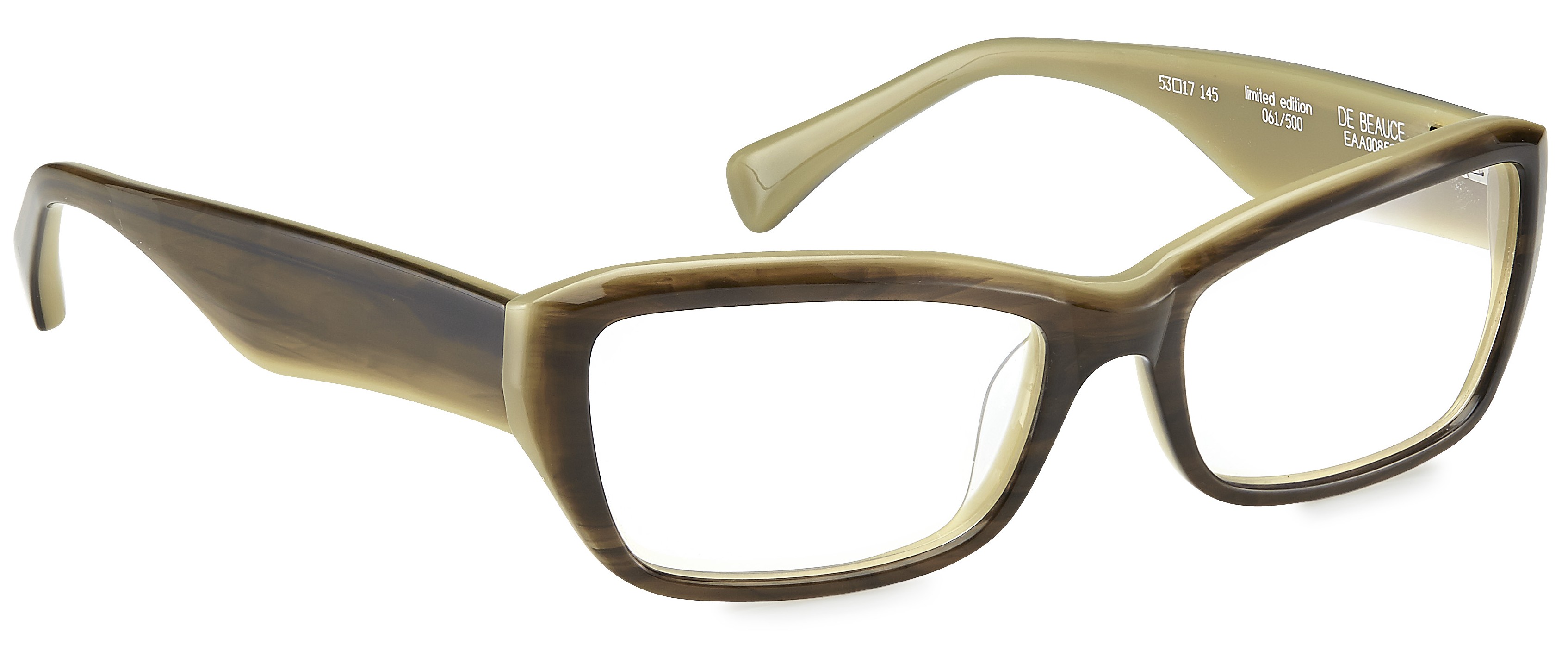 Designer Jeremy Tarian searched for two years to find a particular acetate colour to include in his collections. The Silmo D’Or winner achieved his goal with acetate that looks like horn, created exclusively for Tarian. The variance in the colourations and shadings give De Beauce a classic dignity and beauty. www.jeremytarian.com JG