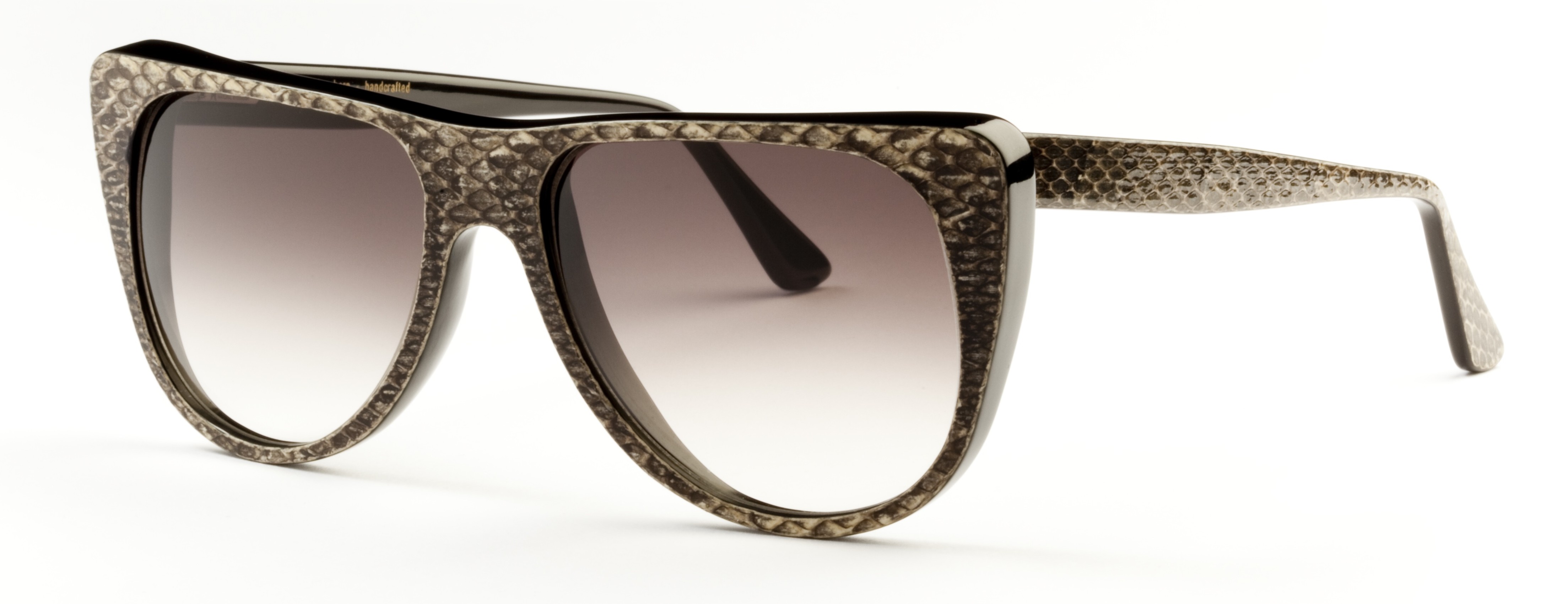 Unusual materials to be found in eyewear include the unexpected use of snakeskin, favoured by Dutch designer Ralph Vaessen. I spotted these sunglasses at jlc opticien on chic and fashionable Rue de Bac in Paris, and liked the oversized shape, strong brow and linear movement. The fit is superb too. Vaessen’s entry into eyewear came about as a fluke – he couldn’t find frames that he really liked, and an optician suggested that Vaessen design his own frames. The optician knew a small atelier that could make them. Already passionate about music, art, fashion and architecture, Vaessen has found his true metier in creating luxurious, unique eyewear, and was nominated for a Silmo D’Or in 2010. More details at www.ralphvaessen.com and www. jlcopticien.com JG
